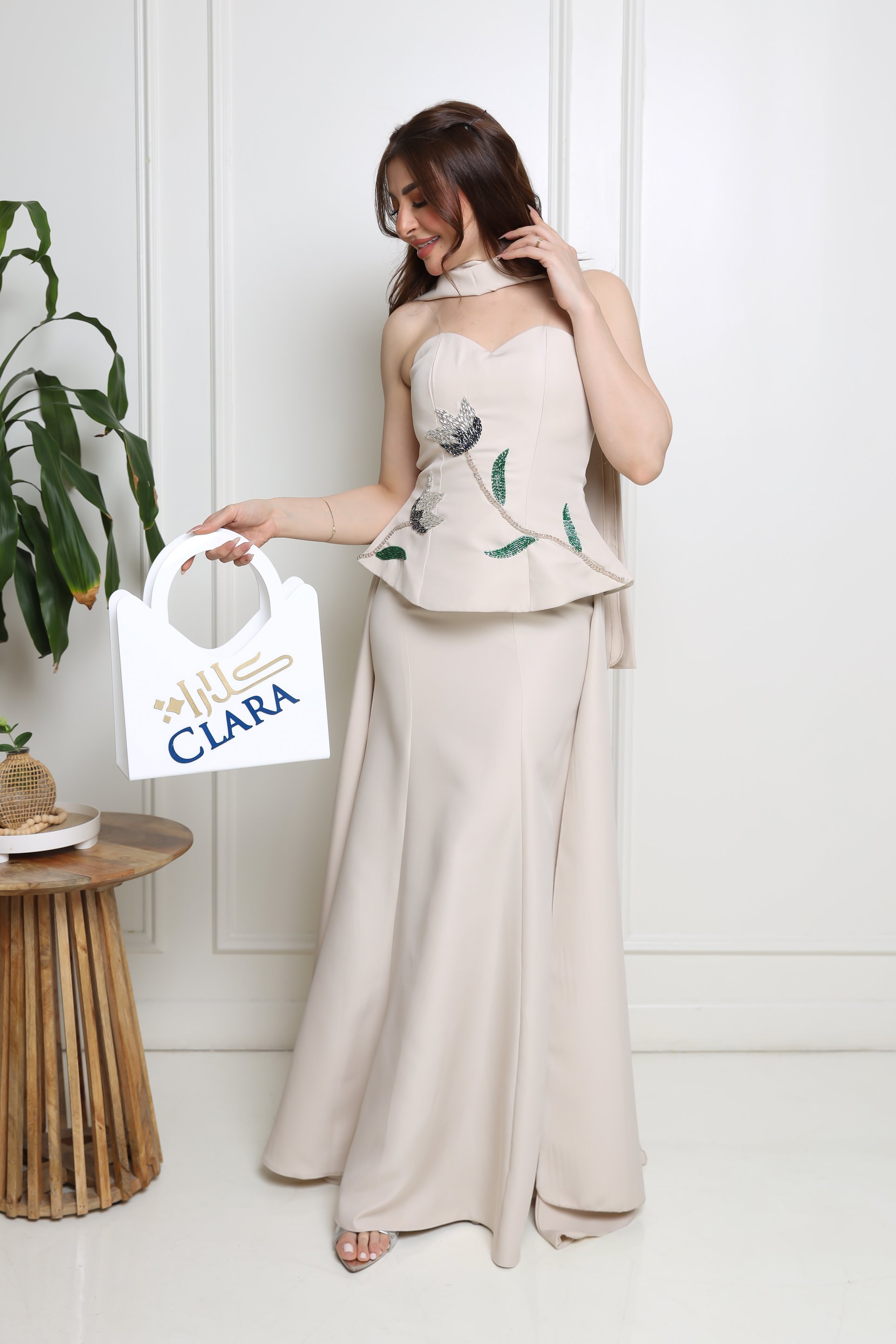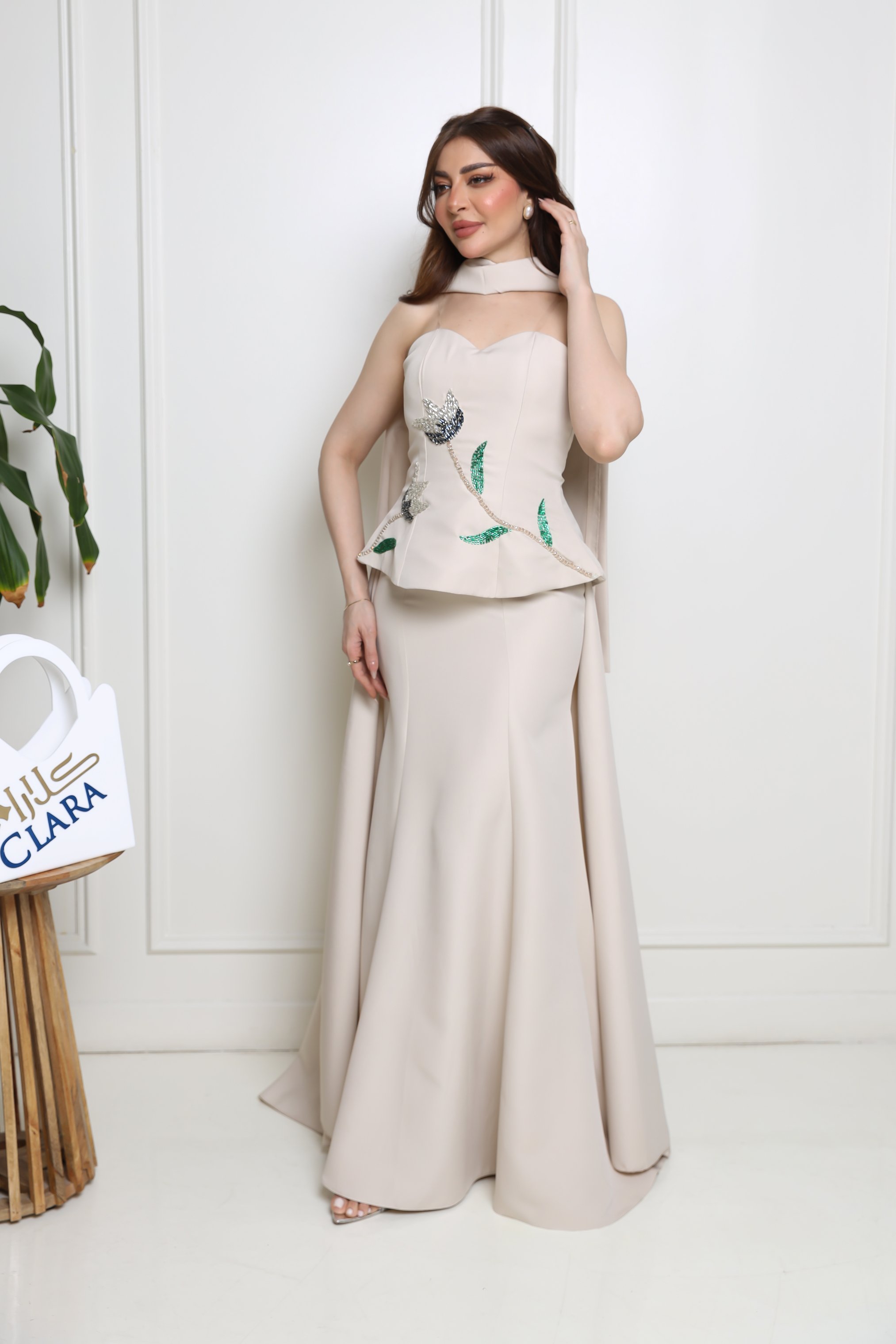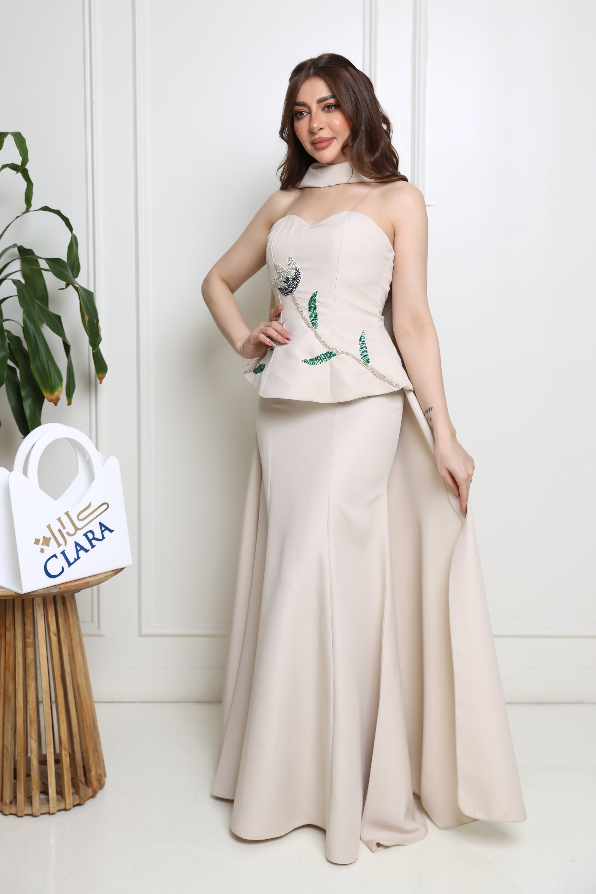 فستان سهرة أنيق باللون البيج الناعم، يجمع بين الفخامة والأنوثة ليمنحك إطلالة راقية تليق بأجمل مناسباتك. تصميمه العصري بخطوط انسيابية وتطريز فاخر يجعل منه الخيار الأمثل للسهرات، حفلات الخطوبة، وحفلات العشاء الفاخرة.