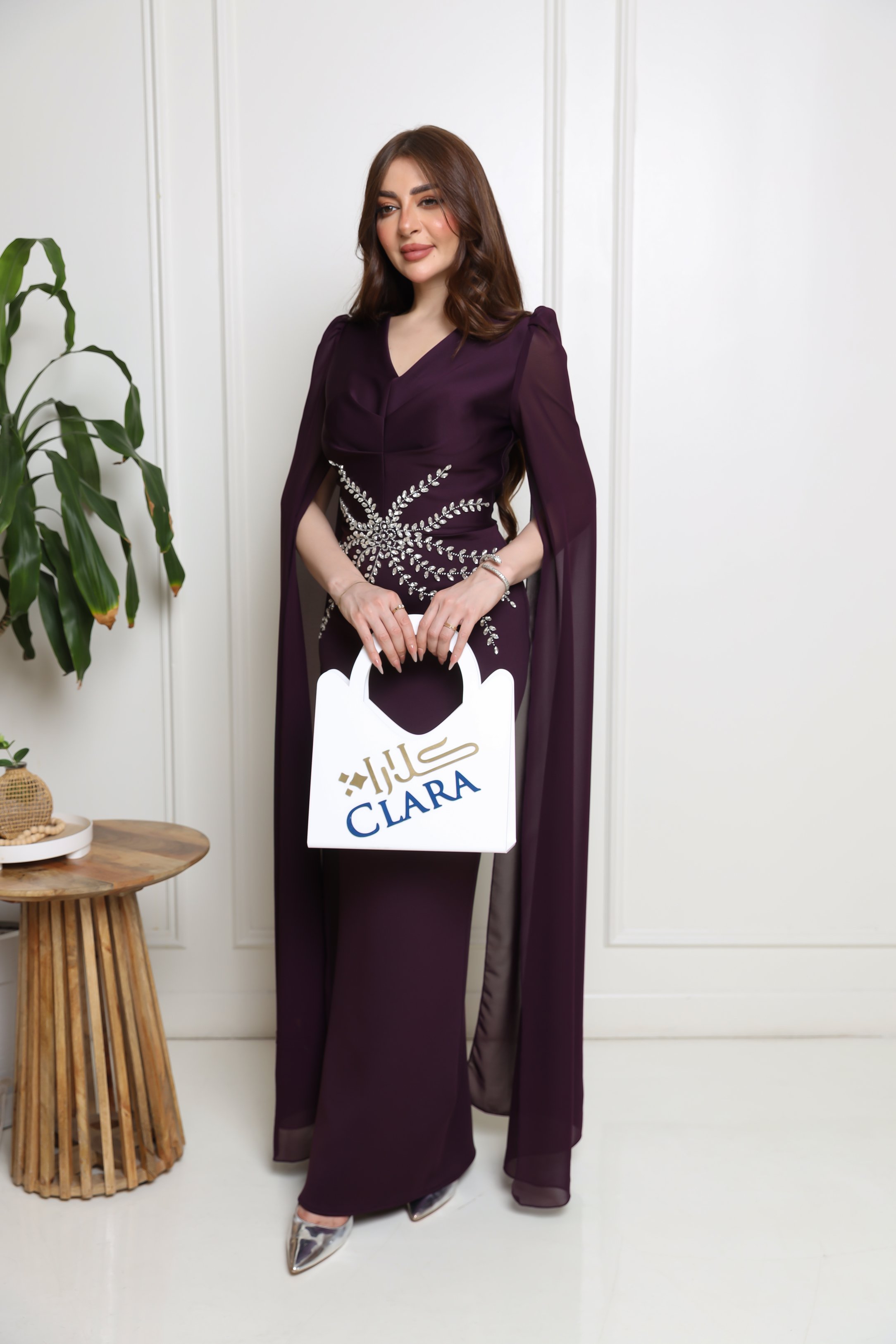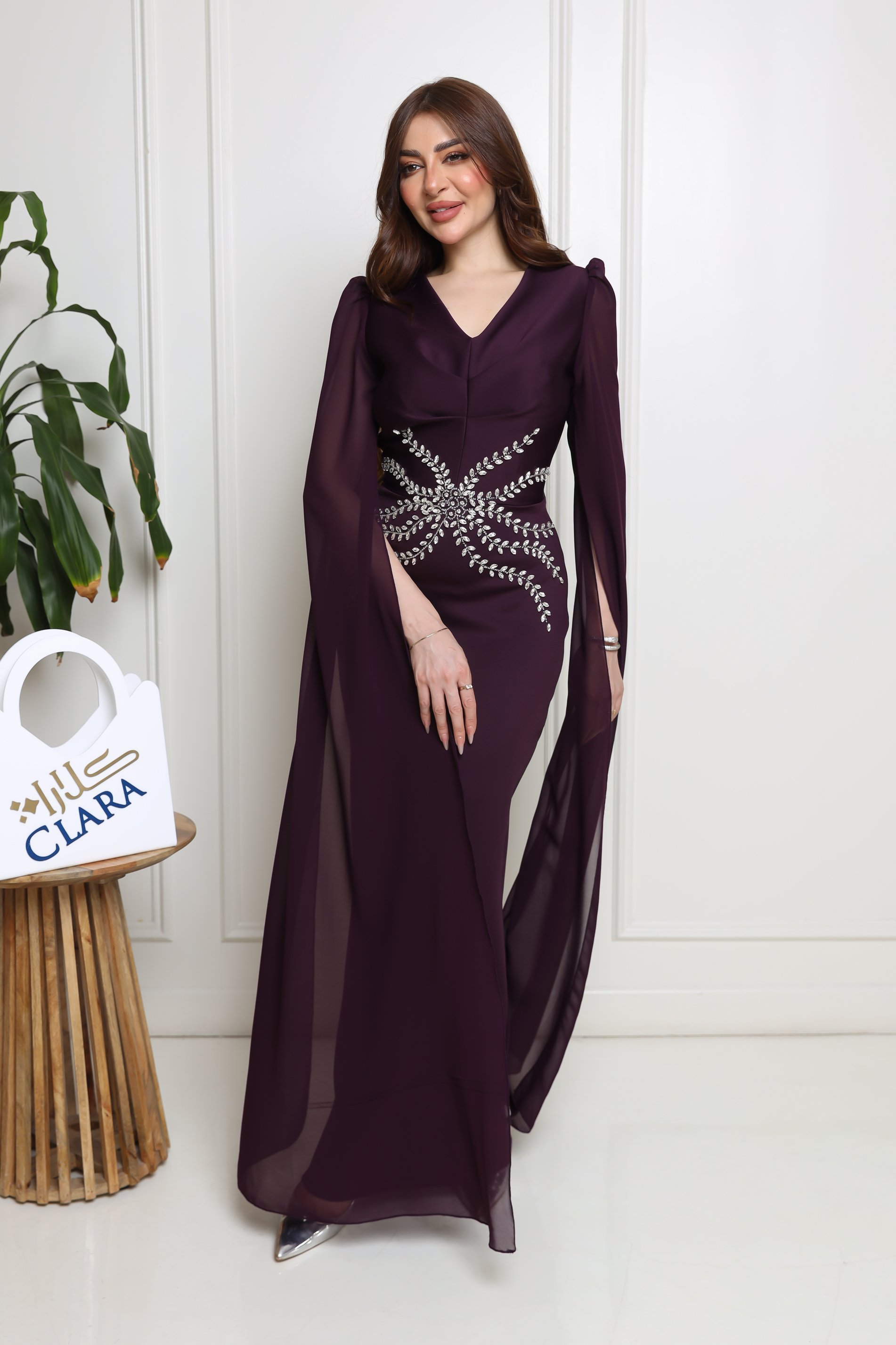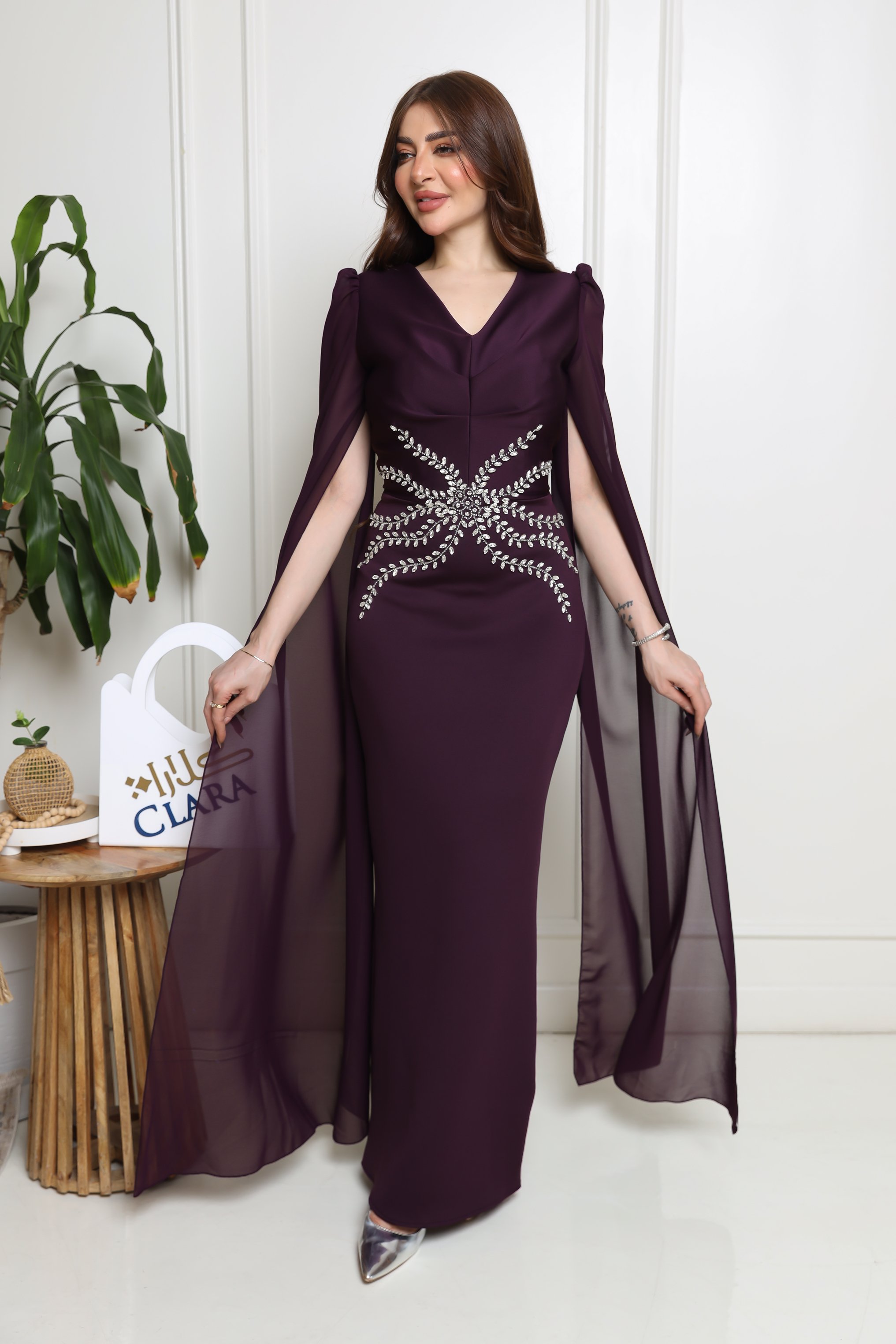 فستان سهرة بنفسجي أنيق بتصميم راقٍ وتطريز فضي فاخر يبرز الخصر بأسلوب ملوكي، مع كاب شيفون انسيابي يضفي لمسة من الفخامة والرقي.