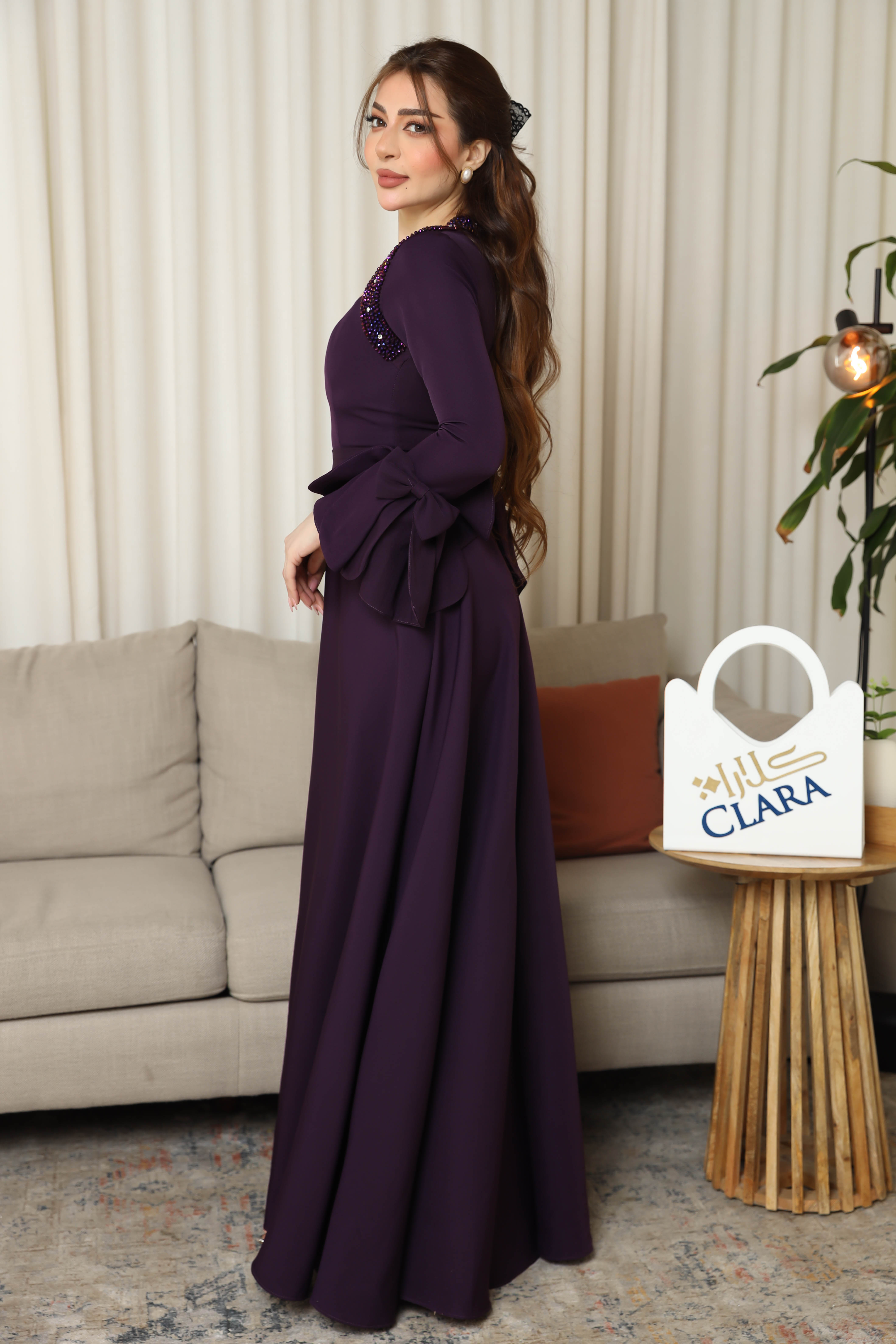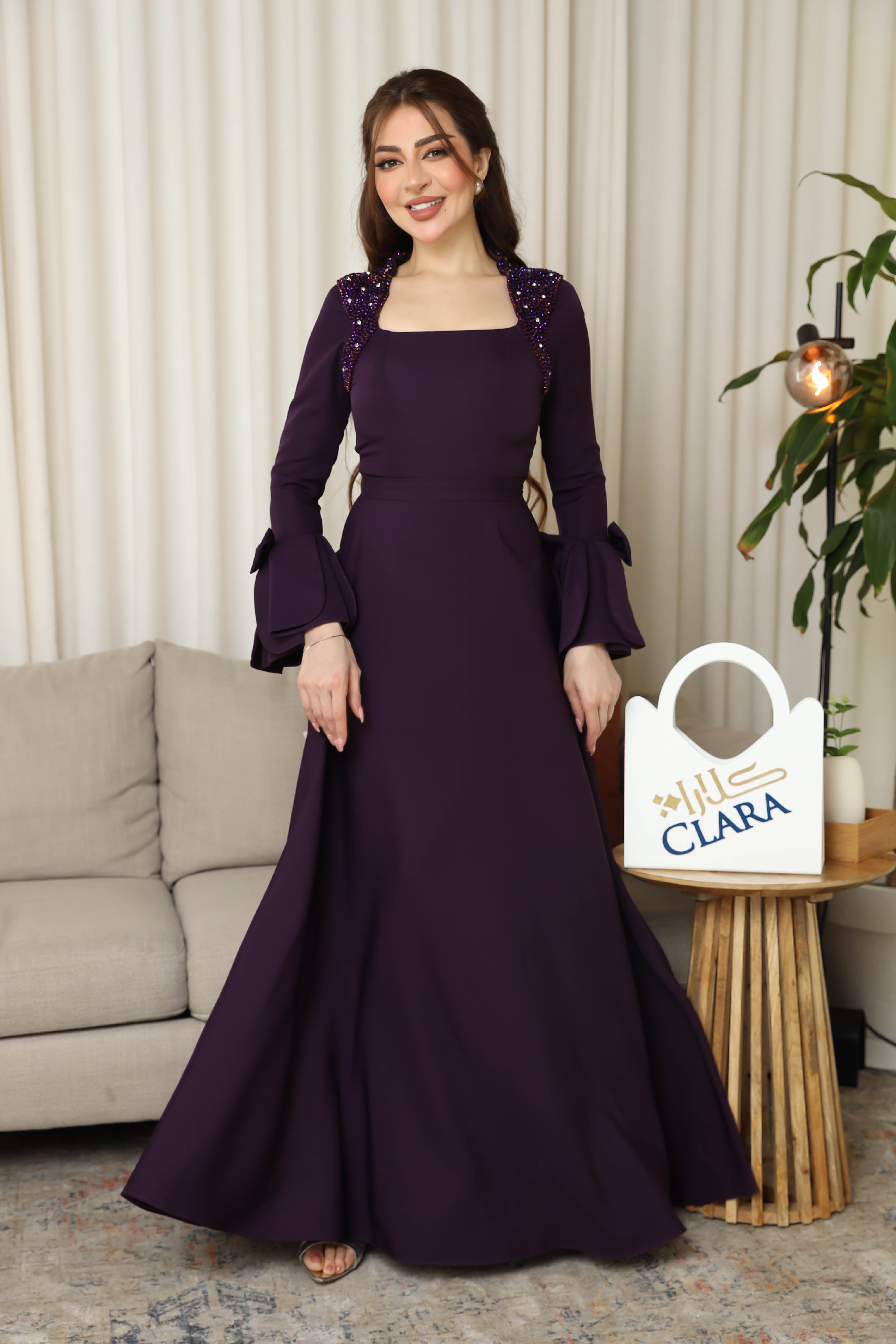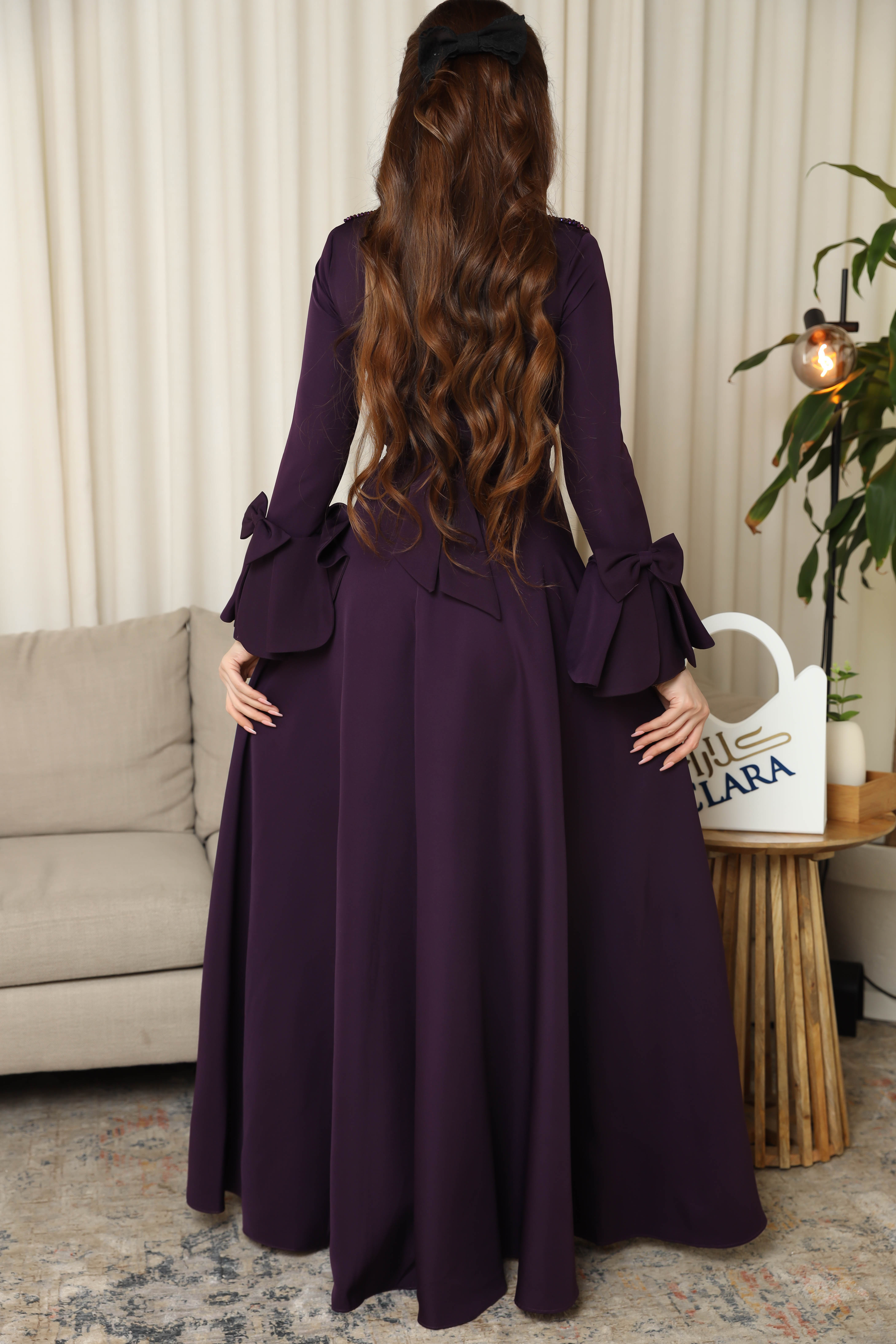 فستان سهرة بنفسجي أنيق بتصميم فاخر يزينه تطريز لامع على الأكتاف وأكمام واسعة بعقد ناعمة، يمنحك إطلالة ملكية فخمة تلفت الأنظار في المناسبات.